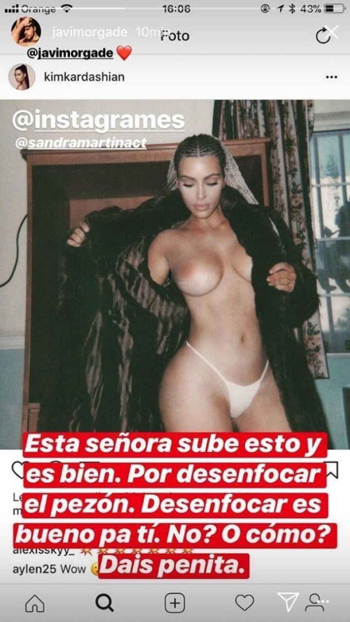 Pero su enfado, lejos de apaciguarse con los mensajes se apoyo de sus fans, ha ido en aumento. Para apoyar su teoría, Martín ha compartido una imagen de Kim Kardashian semidesnuda, pero con el pezón difuminado. Una solución que no ha convencido a la actriz. "Esta señora sube esto y es bien. Por desenfocar el pezón. Desenfocar es bueno para ti. ¿No? ¿O cómo? Dais penita", afirma la actriz en letras subrayadas en rojo sobre la imagen.