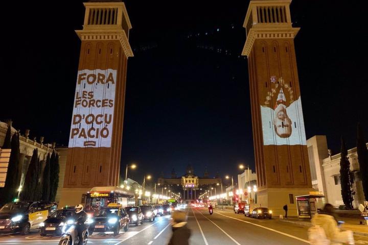 La ANC proyecta la imagen del Rey boca abajo en las Torres Venecianas de Barcelona