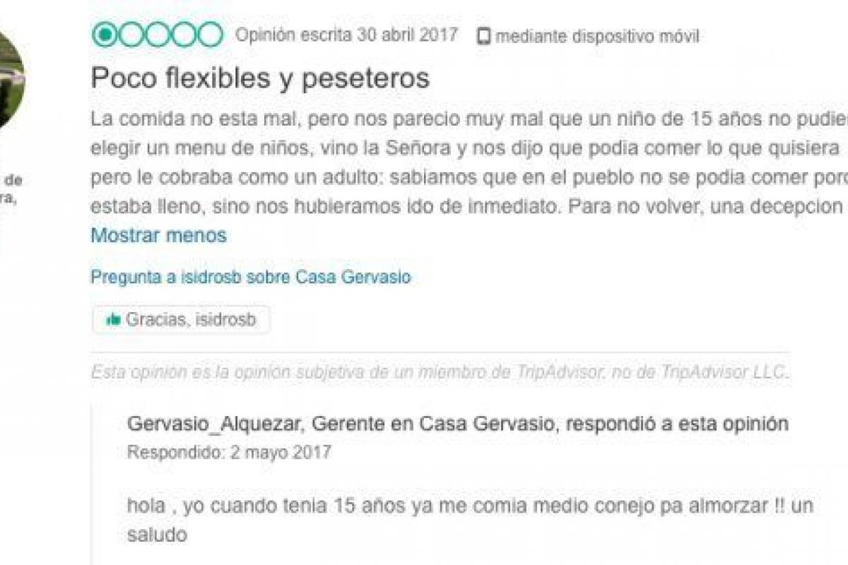 Todo comenzó cuando un cliente protestó —a través de la web Tripadvisor— porque el establecimiento —Casa Gervasio— no le quiso poner menú infantil a su hijo de 15 años y le cobró como a un adulto: "Nos pareció muy mal que un niño de 15 años no pudiera elegir un menú de niños. Vino la señora y nos dijo que podía comer lo que quisiera pero le cobraba como un adulto", escribe el comensal indignado en la citada web.