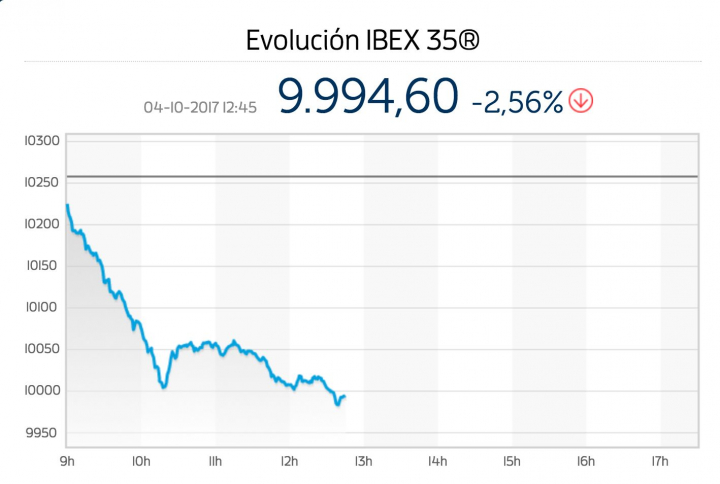 Se ha cruzado la barrera. La Bolsa española cae a fuerza. El Ibex 35 perdía a media sesión de este miércoles la cota psicológica de los 10.000 puntos al dejarse más de un 2,5% por la crisis en Cataluña.