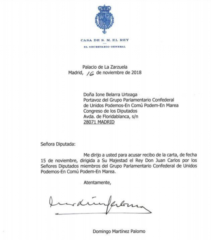 En el escrito "a la atención de Juan Carlos I", firmado por los diputados del grupo confederal, emplazan al anterior jefe del Estado a que sea él mismo quien pida comparecer después de que la Mesa de la Cámara Baja, con los votos de PP, PSOE y Cs, haya rechazado en dos ocasiones investigar los negocios del monarca emérito, como pide Unidos Podemos.