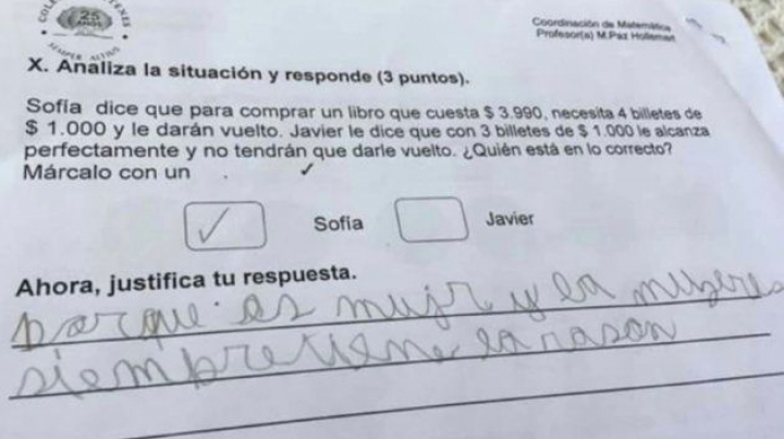 La respuesta del alumno ha dejado a muchos sin palabras: "[Sofía está en lo correcto] porque es mujer y las mujeres siempre tienen la razón", asegura el joven estudiante.