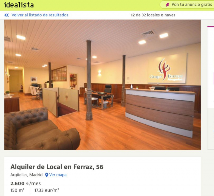 “Magnífico local comercial en la calle Ferraz, acondicionado actualmente como despacho de abogados. Ideal dar continuidad a la misma actividad o cualquier otra actividad de oficina para evitar tener que reformarlo”, detalla el anuncio.