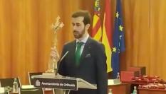 “Pues bien, esta joven promesa de la política, que ya ha capado todas sus redes sociales, ha entrado en el Ayuntamiento de Orihuela con solo 20 años y lo ha hecho a los grande, con una cruz de más de medio metro para jurar su cargo”, ha descrito Mateo, quien ha pedido no fijarse sólo en la cruz, sino también en su discurso de juramento: “Juro por dios y por España cumplir fielmente las obligaciones del cargo del concejal del Ayuntamiento de Orihuela con lealtad al rey y guardar y hacer guardar la Constitución como norma fundamental del Estado. Y acatar por imperativo legal y contra mi conciencia el Estatuto de Autonomía de la Comunidad Valenciana. Viva el rey y viva España”.