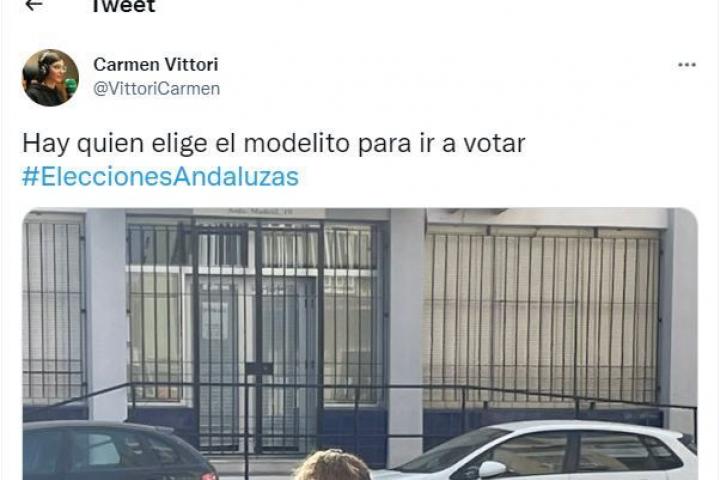 “Hay quien elige el modelito para ir a votar”, ha escrito junto a la imagen, en la que se ve a una mujer con una camiseta en cuya parte trasera lleva escrito el nombre de Vox junto a un dibujo que... es mejor verlo.