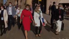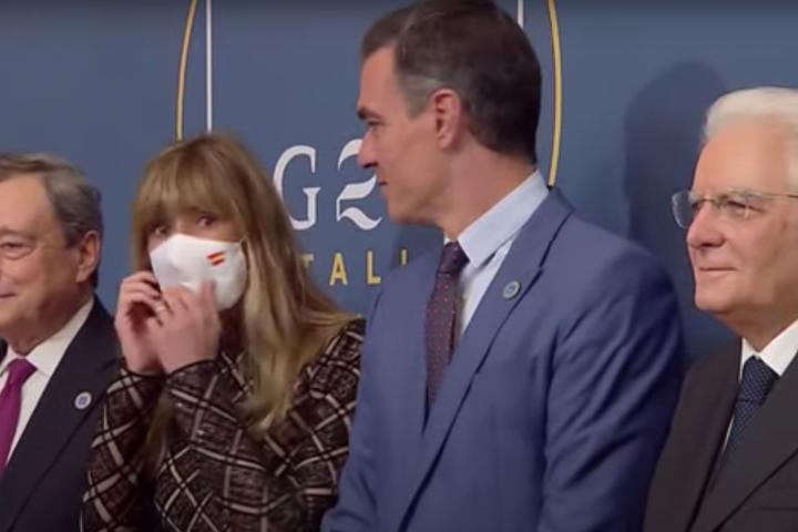La voz de la mujer de Draghi, Maria Serenella Cappello, avisándole de que se podía quitar la mascarilla ha sido la que le ha dado la pista de su despiste. La cara de la mujer de Sánchez al percatarse no podía ser más explícita.