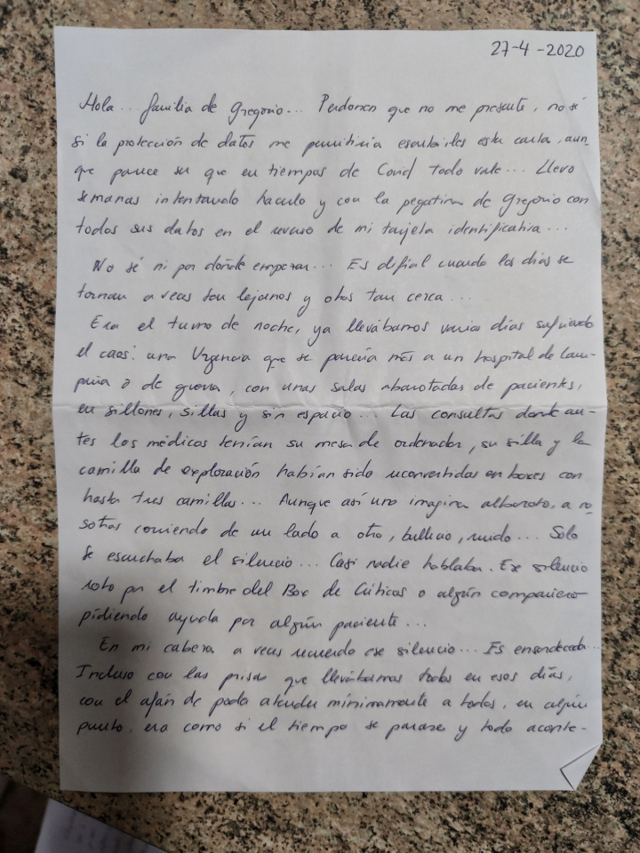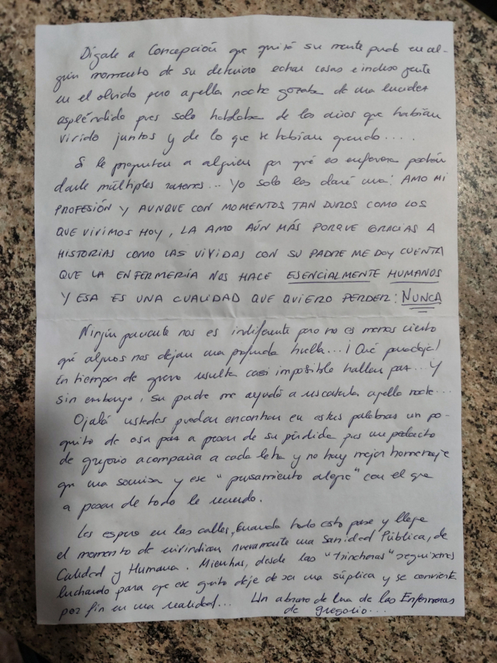 Esta frase forma parte de una larga carta que la enfermera escribió a mano e hizo llegar a la familia de Gregorio varios meses después de su fallecimiento. “A mi abuelo le ingresaron el día del padre y falleció el 23 de marzo. La enfermera escribió la carta en enero a casa de mi abuela, pero yo no la había leído hasta ahora”, cuenta Laura Cañadilla, nieta de Gregorio, a El HuffPost.