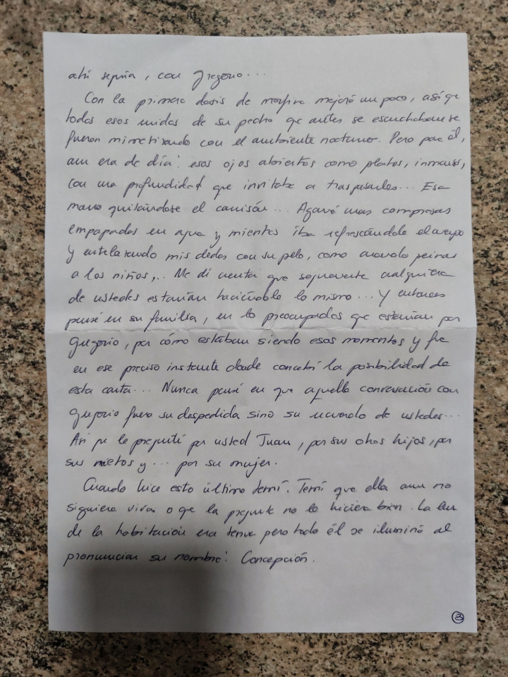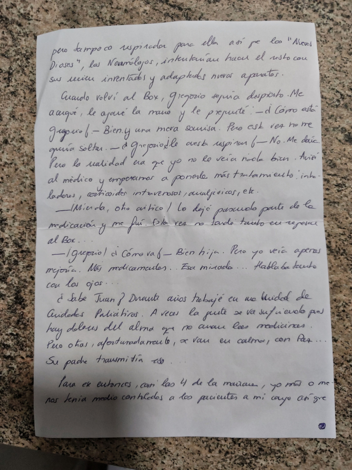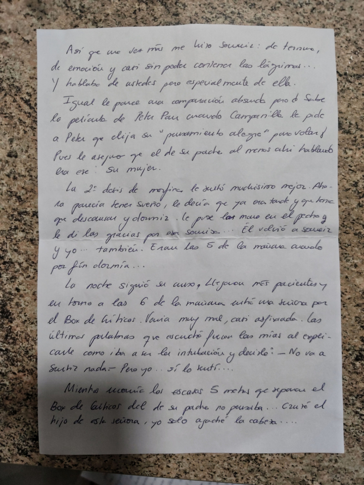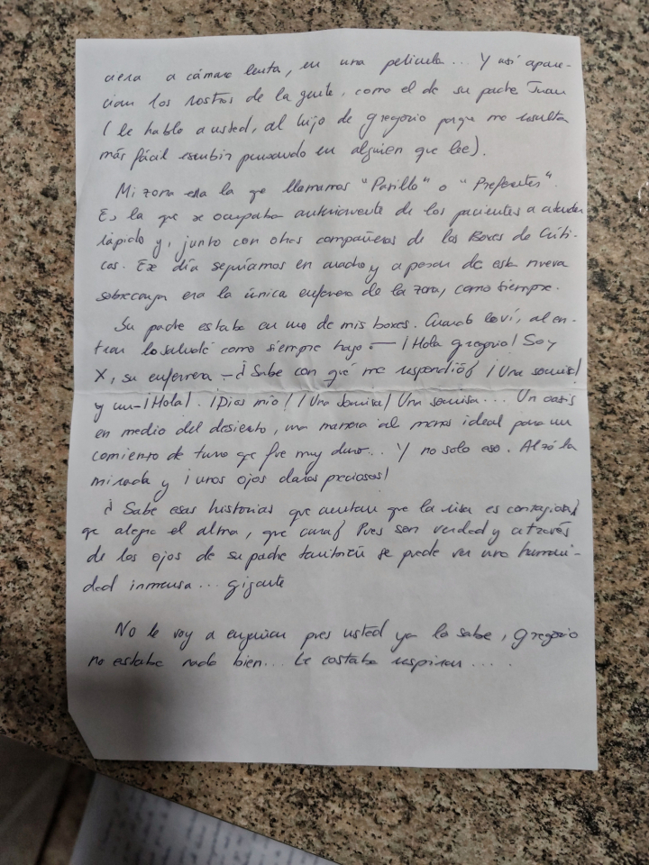 “Entonces pensé en su familia, en lo preocupados que estarían por Gregorio, por cómo estaban siendo estos momentos y fue en ese preciso instante cuando concebí escribir esta carta”, relata la enfermera.