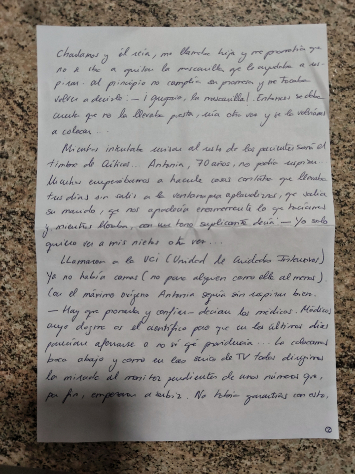 La carta de la enfermera cuenta en primera persona cómo fue la batalla contra el covid en el hospital y cómo fueron los últimos días de Gregorio. “Agarré una compresas empapadas en agua y mientras iba refrescándole el cuerpo y entrelazando mis dedos con su pelo, como cuando peinas a los niños, me di cuenta de que seguramente cualquiera de ustedes le hubiera hecho lo mismo”, escribe la enfermera.