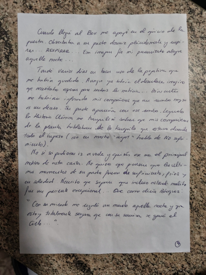 Ella fue quien recibió la carta en su casa, que llegó varios meses después del fallecimiento. La enfermera tardó un tiempo en atreverse a enviarla, debido a la protección de datos. “Cuando mi abuela dijo que había recibido una carta, como ella no sabe leer muy bien, yo no pensaba que fuese algo así”, cuenta Laura.