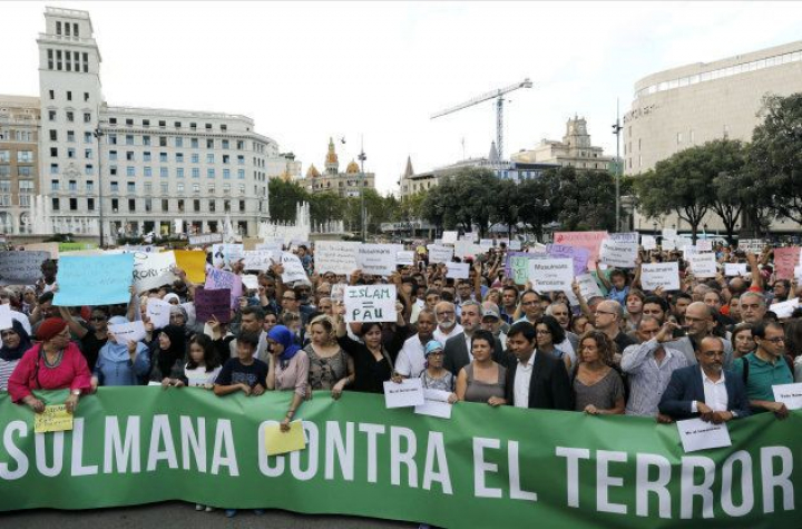 Un momento de la concentración en la Plaza Catalunya de Barcelona con el lema "La comunidad musulmana contra el terrorismo", en la que participan m�s de 140 entidades y asociaciones musulmanas de la ciudad y alrededores en repulsa por los ...EFE
