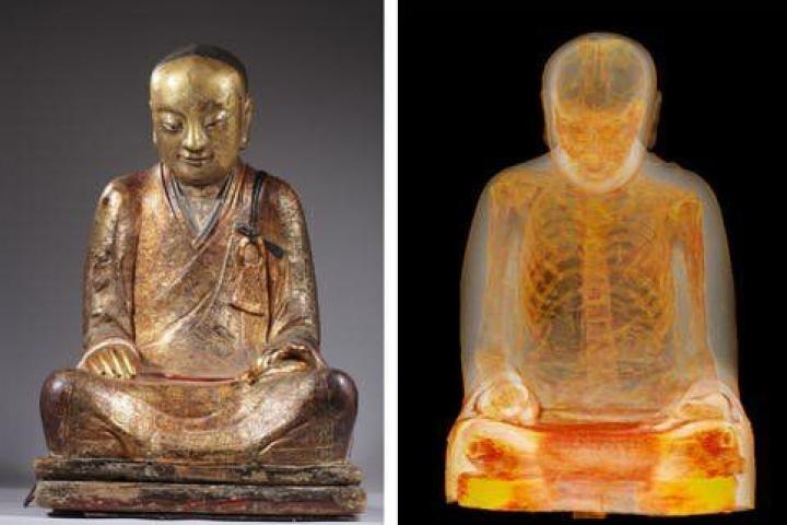 Sí. Dentro de la escultura había un cadáver en posición de flor de loto. Pero no se preocupen, esto no pilló desprevenidos a los trabajadores del centro. En 1997 ya se había descubierto que la estatua guardaba el cuerpo de un monje momificado mediante un exigente rito de automomificación en vida. Eso sí, la tomografía ha permitido estudiar su cuerpo, de unos mil años de antigüedad, como difícilmente se podría haber imaginado. En este caso podemos decir, literalmente, que la estatua tiene huesos.