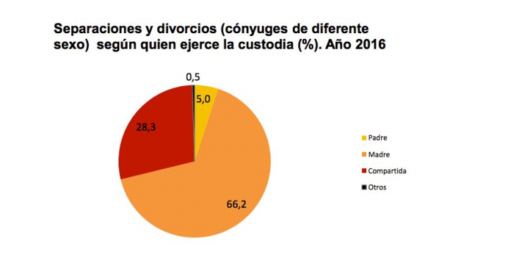 En el 66,2% de los casos la custodia de los hijos menores fue otorgada a la madre, una cifra inferior a la del año anterior (69,9%). En el 5% de los procesos la custodia la obtuvo el padre (5,1% en 2015), en el 28,3% fue compartida (24,7% el año anterior) y en el 0,5% se otorgó a otras instituciones o familiares