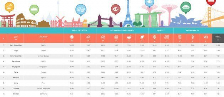 Como se ve en la tabla, la victoria de San Sebastián no es la única buena noticia para la gastronomía española: Barcelona y Madrid también aparecen en el ránking, en la cuarta y la séptima plaza, respectivamente. España es el único país que tiene tres ciudades en las diez primeras posiciones.