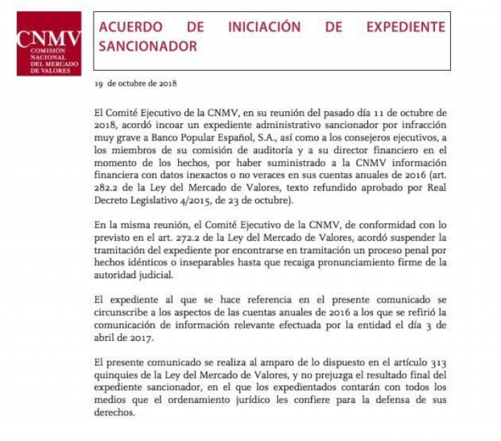 El comité ejecutivo de la CNMV decidió la apertura de este expediente administrativo sancionador por infracción muy grave a Banco Popular en su reunión del pasado 11 de octubre. Se trata del mismo tipo de expediente que tiene abierto Telepizza, que se conoció hace justo dos semanas.