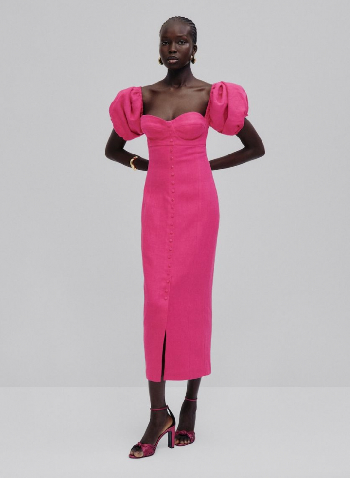 De todas las prendas, la joya de la corona es un vestido rosa fucsia fabricado en lino que es perfecto para una boda, una comunión o una fiesta especial. Se trata de un diseño de escote corazón, mangas abullonadas y botonadura frontal que, además, es fresquito gracias al tejido.