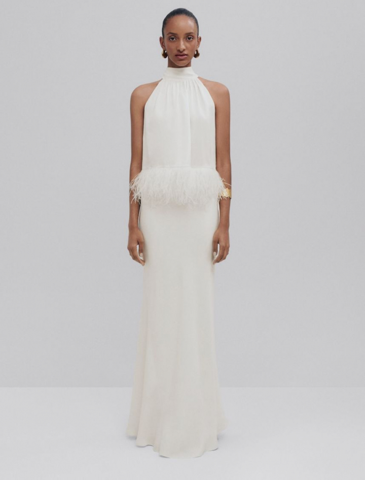 La firma de Inditex no solo propone opciones para invitadas, también para aquellas novias que buscan salirse de los trajes más tradicionales. Para ellas, hay varios conjuntos, como el que combina una falda larga satinada con un top de cuello halter rematado en plumas, que aporta un toque sofisticado.