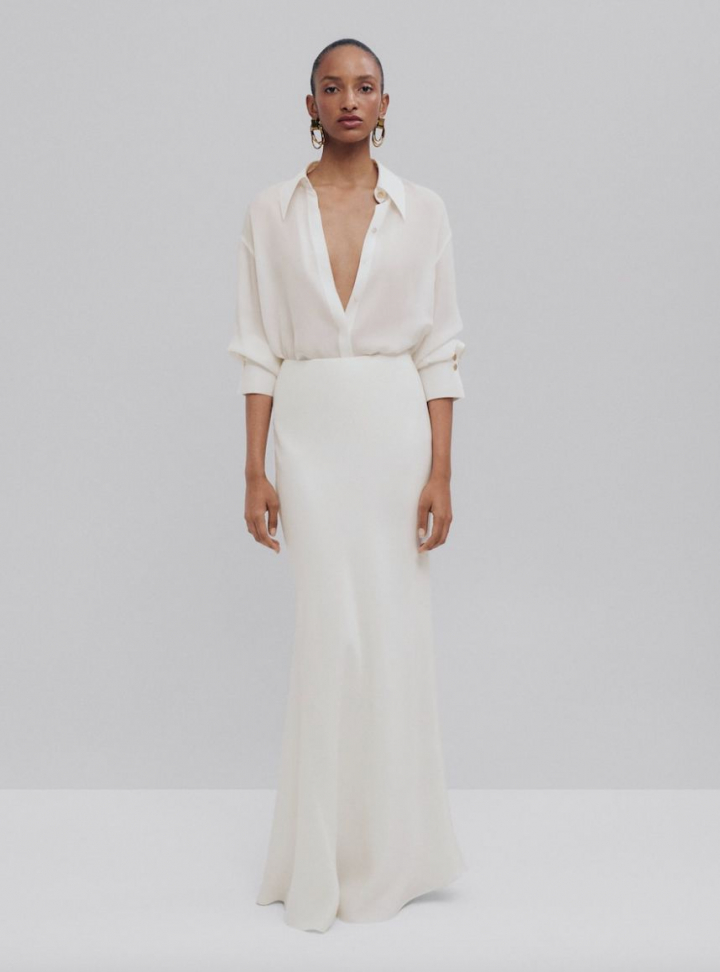 Massimo Dutti también propone combinar esta falda con una clásica camisa blanca en un look sencillo y elegante del que se pueden reutilizar todas las piezas para el día a día.