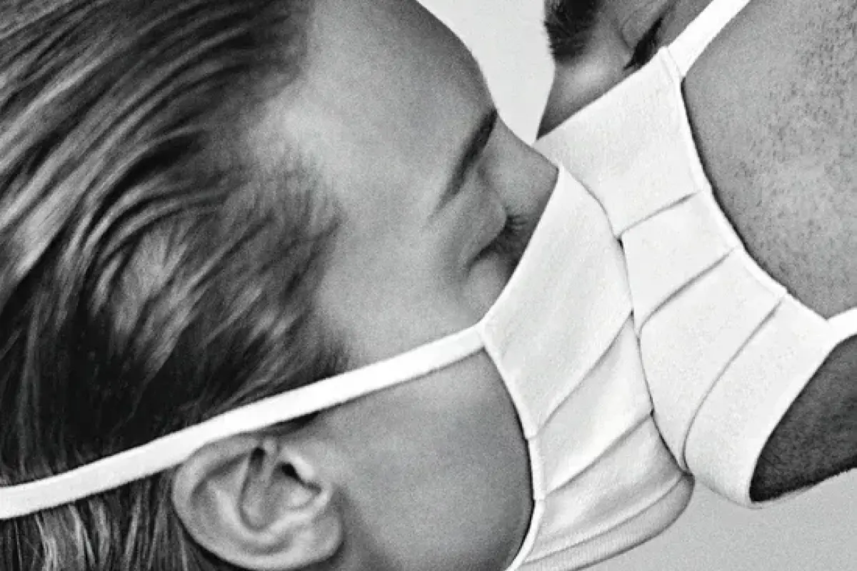 Dos modelos anónimos se besan parapetados por sendas mascarillas. Una imagen cargada de intención, pero una imagen que no es nueva.