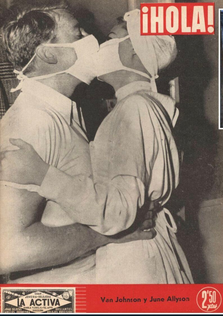 En 1937 hubo una epidemia de gripe en Hollywood y los actores ensayaron escenas de besos con mascarillas para ayudar a prevenir su propagación. De ahí, esta portada.