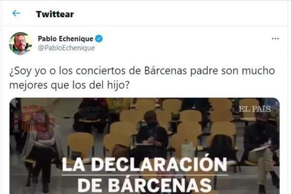 ″¿Soy yo o los conciertos de Bárcenas padre son mucho mejores que los del hijo?”, publicó Echenique el lunes junto a un vídeo de Bárcenas declarando y en referencia a Taburete, el grupo que lidera Willy Bárcenas.