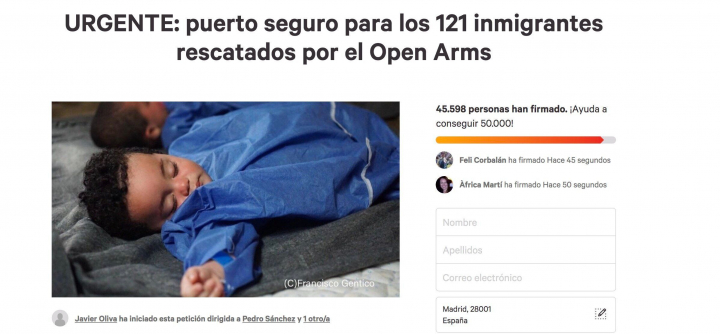 La iniciativa, ya supera las 100.000 firmas. “España puede ofrecer un puerto seguro o mediar en la UE para conseguir uno en Malta o Italia”, señala la petición lanzada en esta plataforma.