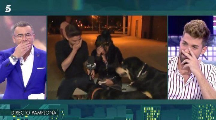 Los perros se empezaron a subir a los brazos del reportero con una pelota en la boca pidiendo que alguno de los dos jugase con ellos. Mientras todos los colaboradores del plató reían, los perros ladraban, Galdeano hablaba y el reportero, con cara de circunstancia, intentaba salvar la situación.
