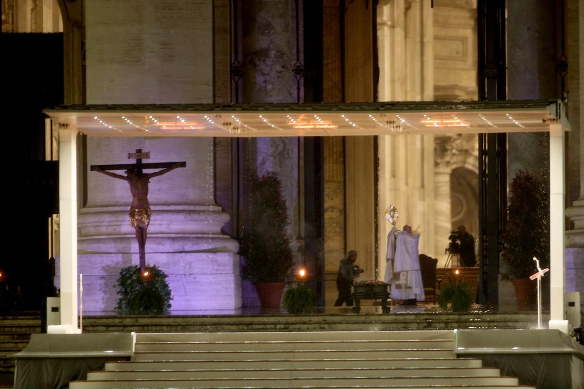 Las fotos, con el papa solo en mitad de la inmensidad de la plaza, han quedado para la historia. Y para la historia quedará también lo que ese mismo día sucedió con el cristo de San Marcelo al Corso, del siglo XIV, que presidió la celebración y quedó seriamente dañado por la lluvia y porque nadie lo protegió.