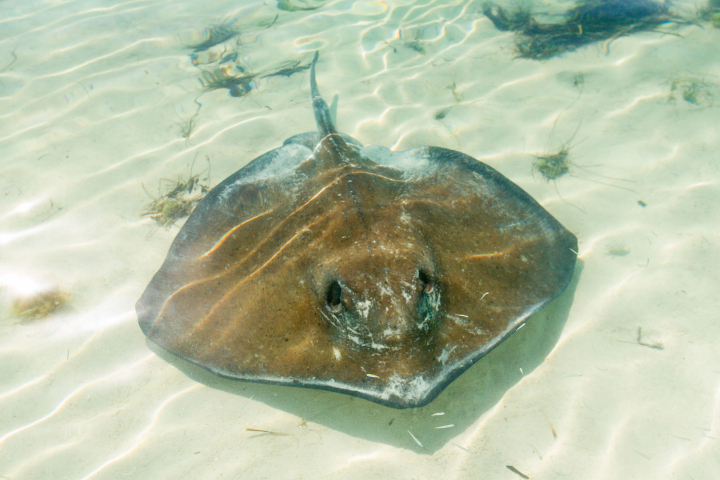 El chucho es un pez raya que llega a alcanzar hasta dos metros, muy frecuente en aguas canarias. Descansan en la orilla, apenas con unos centímetros de agua, escondidos bajo la arena. A algunos se les notan los ojos, o los extremos de las ‘alas’… pero lo más frecuente es el susto cuando se les pisa sin querer. Entonces, al sentirse amenazados, se revuelven, enturbian la arena con sus remolinos y huyen… aunque pueden dejar en los pies alguna herida de su aguijón de cola.