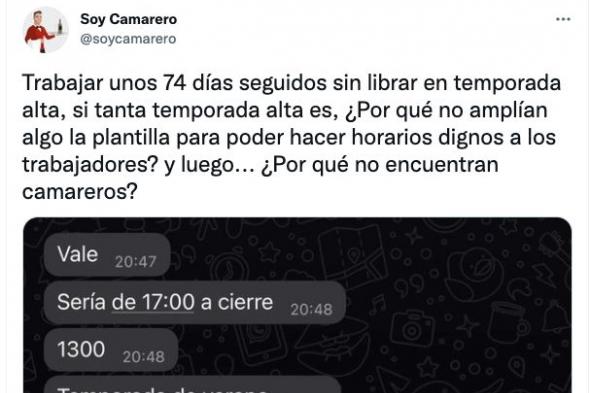 “Trabajar unos 74 días seguidos sin librar en temporada alta, si tanta temporada alta es, ¿Por qué no amplían algo la plantilla para poder hacer horarios dignos a los trabajadores? y luego... ¿Por qué no encuentran camareros?”, ha escrito el usuario junto al pantallazo.