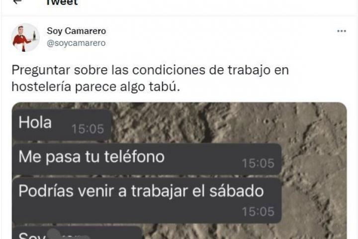 “Preguntar sobre las condiciones de trabajo en hostelería parece algo tabú”, asegura Soy Camarero junto a los mensajes de WhatsApp, que en poco más de un día acumulan más de 5.000 retuits y 30.000 ‘me gusta’.