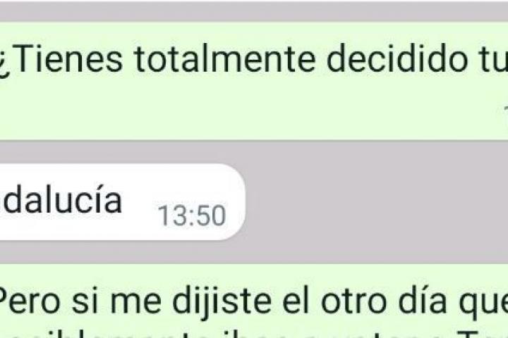 “WhatsApp con un amigo. En las anteriores andaluzas votó a Vox”, señala. En la conversación, se ve cómo le pregunta: ”¿Tienes totalmente decidido tu voto?”. “Por Andalucía”, responde él, nombrado la candidatura que encabeza Inma Nieto y en la que concurren, entre otros, Podemos, Más País e IU.