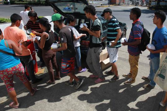 Y reciben ayuda como estos venezolanos a los que unos voluntarios dan de comer en Cali, Colombia.