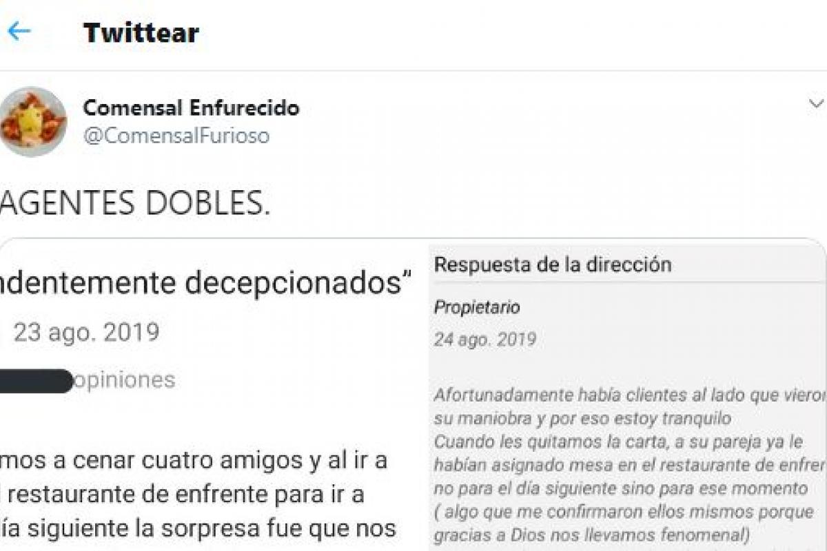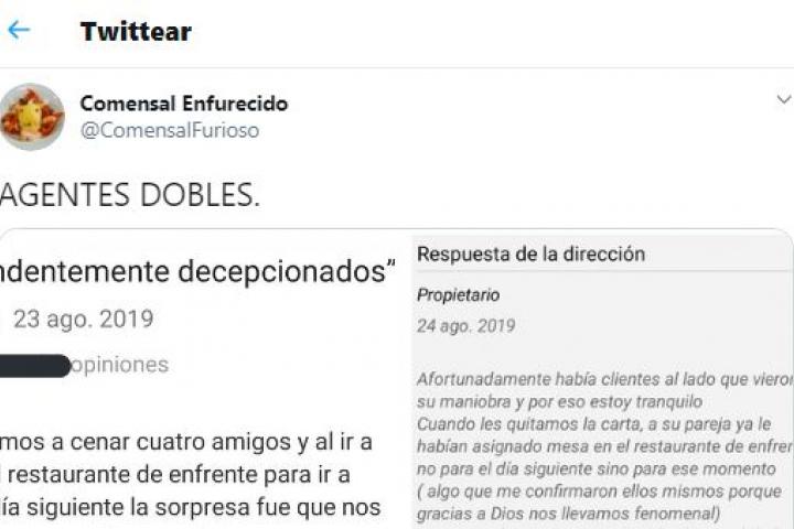 Unos comensales criticaron que el negocio al que iban a ir a comer les retiró “violentamente” la carta de las manos porque los vio en el restaurante de enfrente. El usuario se defiende afirmando que simplemente iban a reservar mesa para el día siguiente: “Se puso a gritar como un energúmeno”.