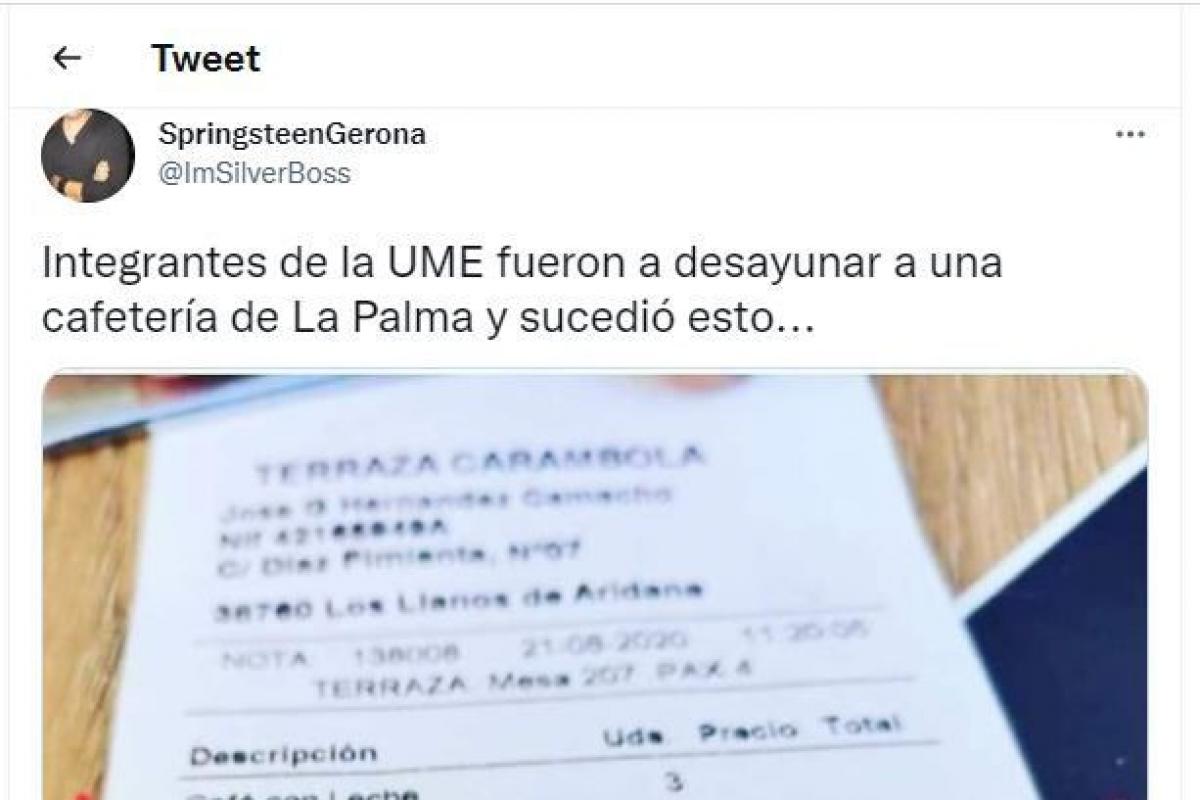 El bonito detalle que tuvo una cafetería de La Palma con varios integrantes de la Unidad Militar de Emergencias (UME) se ha vuelto a convertir en todo un fenómeno en Twitter más de un año después de producirse.