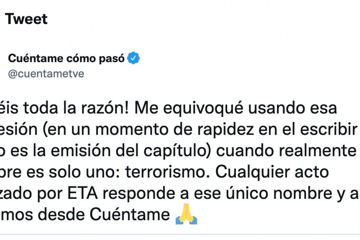 Tras el revuelo, el perfil de la serie ha pedido disculpas citando un tuit de un diputado de Vox: ”¡Tenéis toda la razón! Me equivoqué usando esa expresión (en un momento de rapidez en el escribir como es la emisión del capítulo) cuando realmente el nombre es solo uno: terrorismo. Cualquier acto realizado por ETA responde a ese único nombre y así lo sentimos desde Cuéntame”.