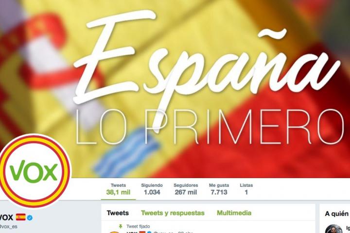La cuenta oficial de Vox en Twitter se ha venido arriba España. El partido de extrema derecha, con 267.000 seguidores, ha basado su estrategia de campaña en sus duros mensajes en la red social del pájaro azul.