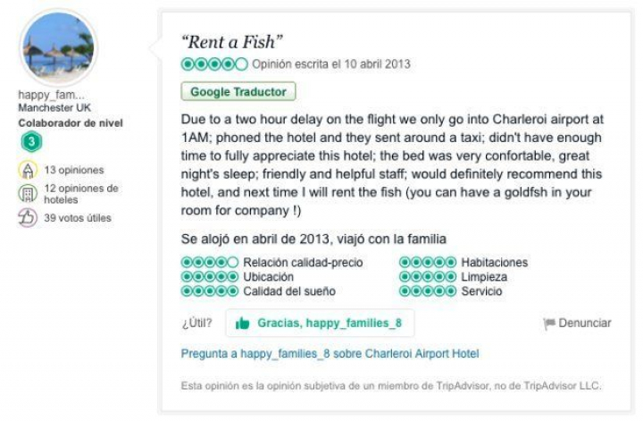 El hotel responsable de esta curiosa oferta es el Hotel Charleroi Airport, a 60 kilómetros de Bruselas. El establecimiento de cuatro estrellas lleva años ofreciendo este servicio. Su gerente, David Dillen, lo ha contado al diario británico The Independent y también se puede ver en comentarios hechos por huéspedes en la web de viajes TripAdvisor. "Definitivamente recomiendo este hotel y la próxima vez alquilaré el pez (puedes tener un carpín dorado en tu habitación como compañía!)", escribe este usuario.