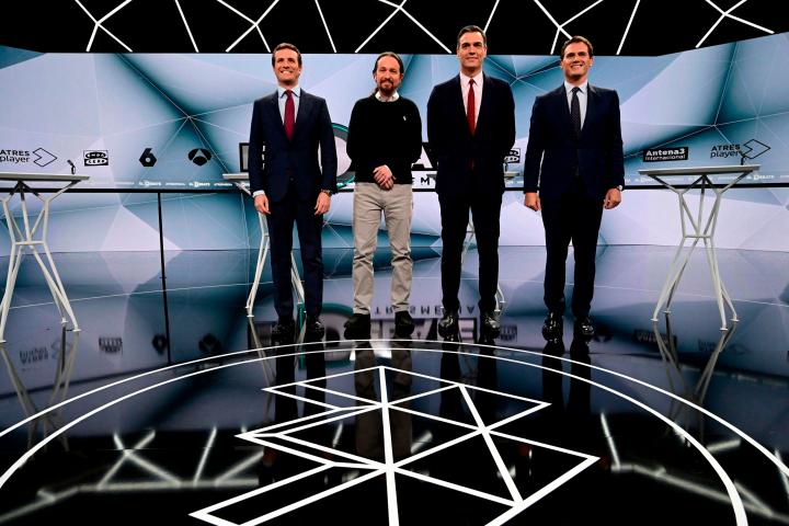 (L-R) Spanish conservative Popular Party (PP) leader Pablo Casado, far-left Podemos party leader Pablo Iglesias, Prime Minister and PSOE candidate Pedro Sanchez and centre-right Ciudadanos (Citizens) leader Albert Rivera pose before a televised ...JAVIER SORIANO via Getty Images