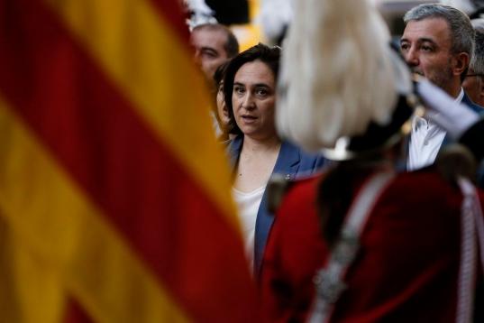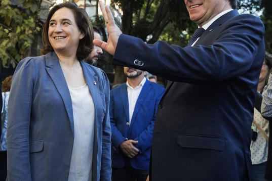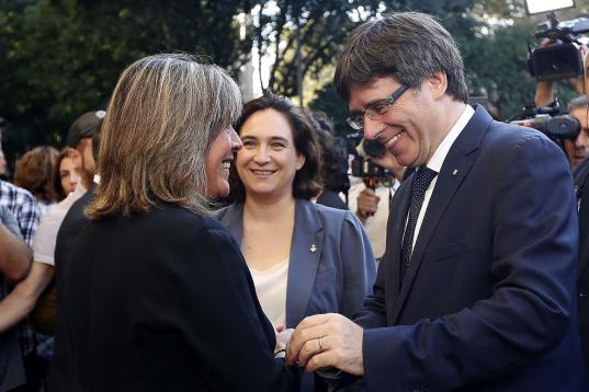 Las alcaldesas de Hospitalet, Núria Marín, y de Barcelona, Ada Colau, conversan con Puigdemont.