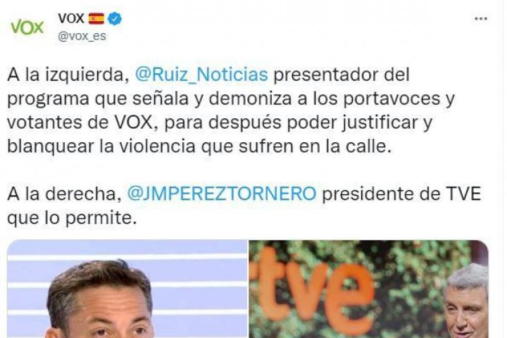“A la izquierda, @Ruiz_Noticias, presentador del programa que señala y demoniza a los portavoces y votantes de VOX, para después poder justificar y blanquear la violencia que sufren en la calle. A la derecha, @JMPEREZTORNERO presidente de TVE que lo permite”, escribió Vox este mismo fin de semana.