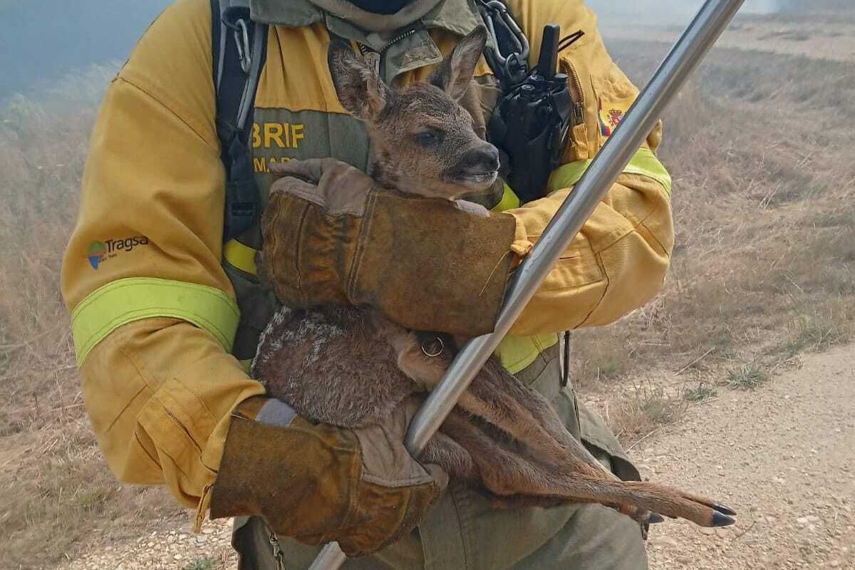 Tras cinco días de intensa lucha contra el fuego en el incendio de la Sierra de la Culebra (Zamora), la Asociación Brigada DO FUMO ha publicado la tierna foto de un cervatillo con vida que ha conseguido sobrevivir a las llamas.