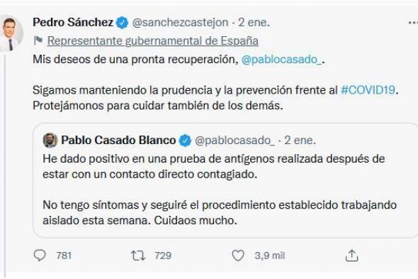 “Mis deseos de una pronta recuperación, @pablocasado_ . Sigamos manteniendo la prudencia y la prevención frente al #COVID19. Protejámonos para cuidar también de los demás”, escribió Sánchez.
