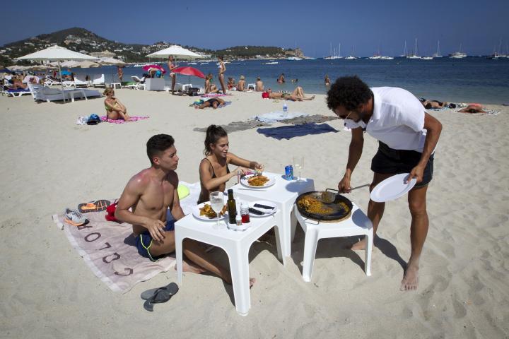 Un camarero sirve paella a unos turistas en la playa de Talamanca, en Ibiza.JAIME REINA via Getty Images