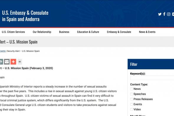 Desde este lunes mantiene activa una alerta de seguridad ante el “aumento de los asaltos sexuales contra jóvenes visitantes y estudiantes estadounidenses en toda España”. Según los representantes diplomáticos estadounidenses, en nuestro país, las autoridades españolas les han reconocido el “alza importante de delitos sexuales”, que no atañe solamente a mujeres norteamericanas, sino a mujeres “en general”. La alerta incluye varias recomendaciones como “beber responsablemente” y viajar acompañado de amigos o familiares.
