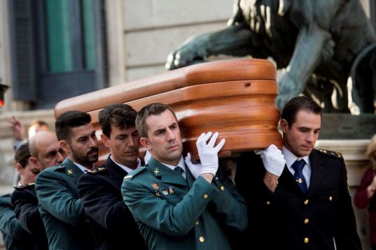El presidente del Gobierno y la presidenta del Congreso consuelan a la viuda, Pilar Goya.