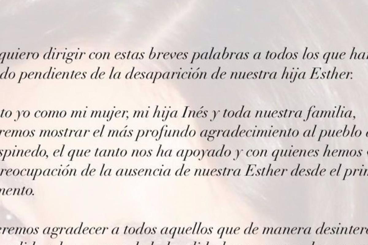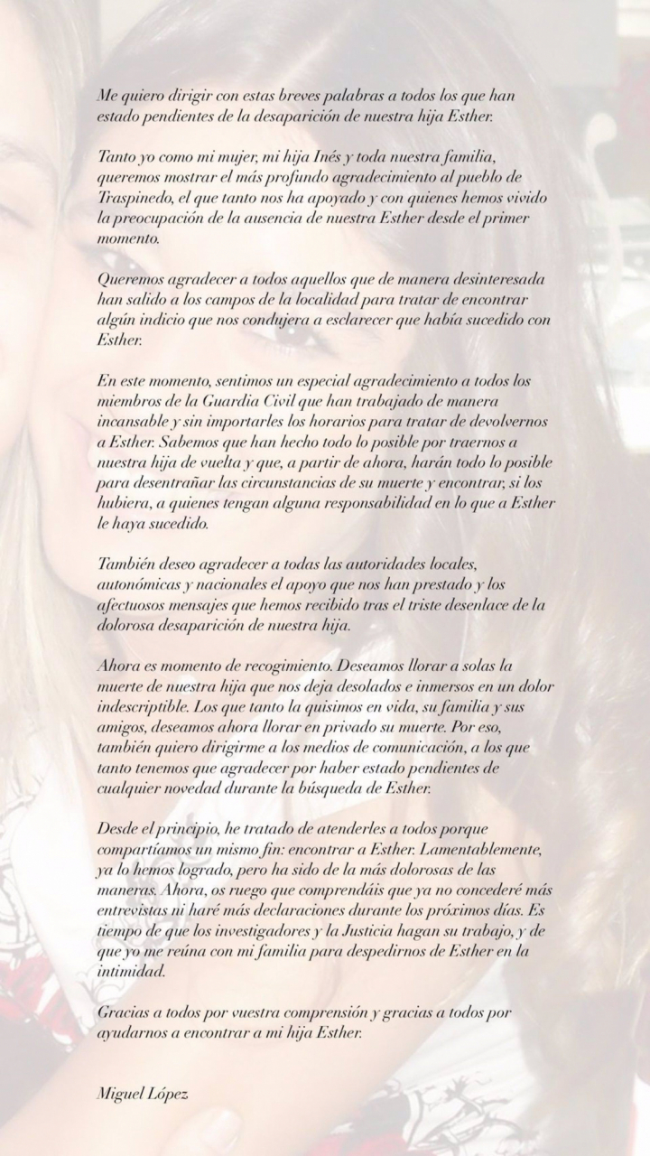 “Gracias a todos por vuestra compresión y por ayudarnos a encontrar a mi hija Esther”, concluye.