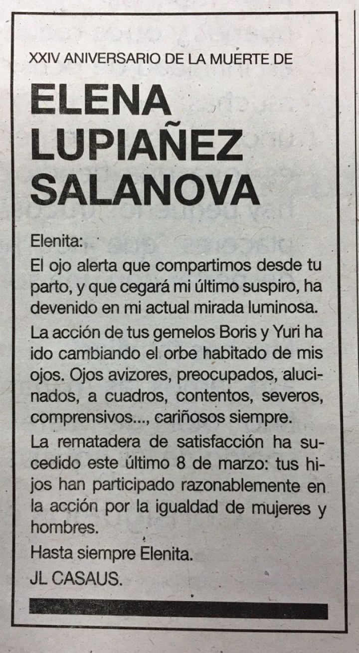 Cada 21 de marzo desde 1994 José Luis Casaus pone una esquela en El País dedicada a Elena Lupiáñez Salanova, Elenita, su mujer fallecida ese día.