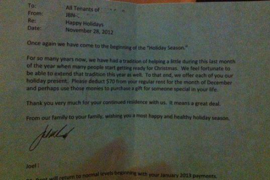 Los caseros majos existen. Un casero que tiene la bendita tradición de hacer un pequeño descuento en la renta. "Nos sentimos afortunados de poder continuar con esta tradición también este año", explican a sus arrendatarios, a los que les pi...