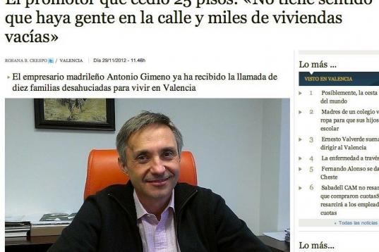 Cedió, a través del Ayuntamiento, 25 pisos en L'Alcudia (Valencia). "No tiene sentido que haya gente en la calle y miles de viviendas vacías", dijo el madrileño Antonio Gimeno en una entrevista a ABC.